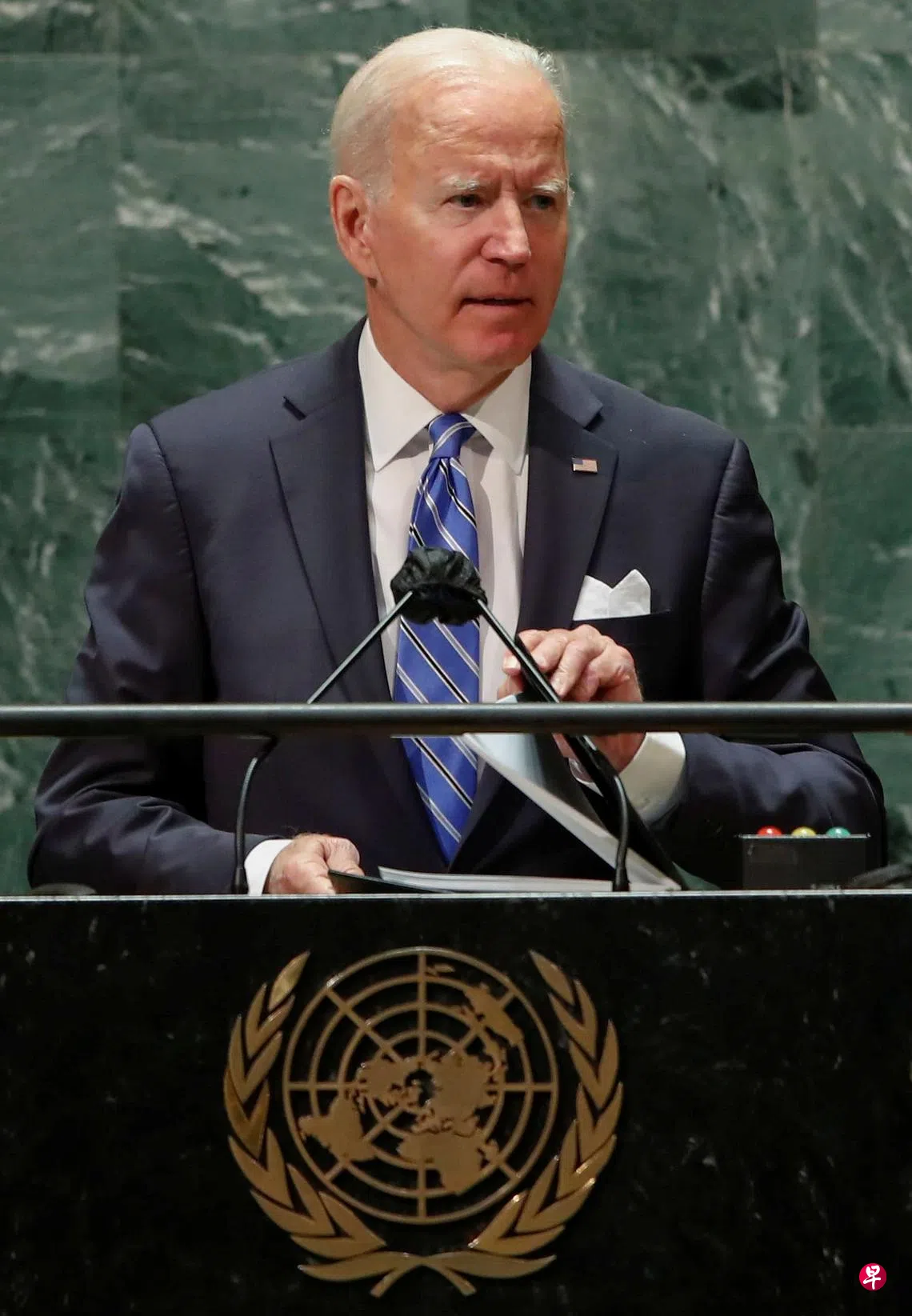 (早报讯)美国总统拜登周二(9月21日)在联合国大会上发表演讲,呼吁全球各国从纷争转向合作,以应对气候变化和疾病带来的威胁。