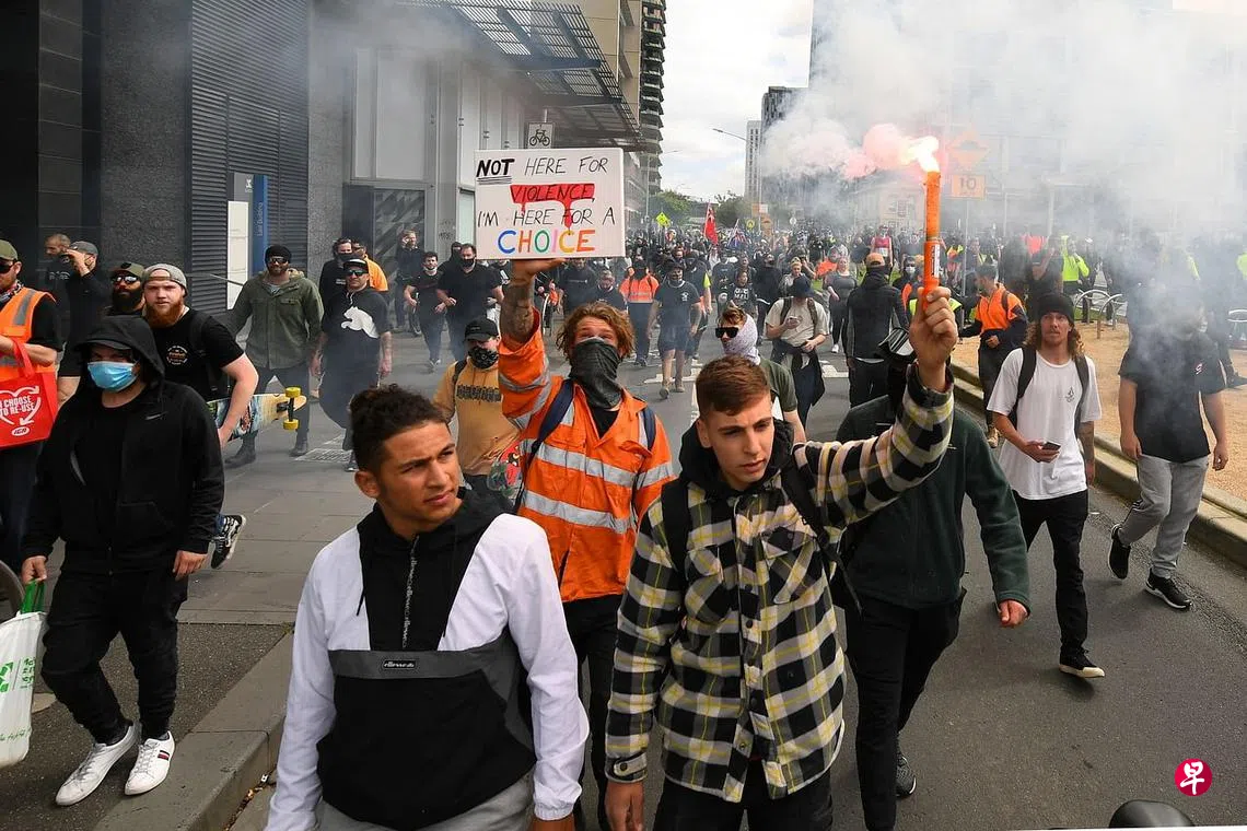 此前,墨尔本当局表示,建筑工人频繁移动,这是冠病散播原因之一,因此宣布关闭建筑工地两周。维多利亚州也要求所有建筑工人本周内接种至少一剂疫苗。这些措施引发建筑工人的不满。除了建筑工人,示威者还包括反对强制性疫苗接种和延长维州封锁者。