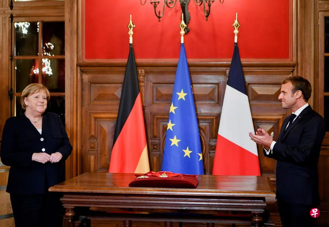 (早报讯)德国总理默克尔周三(3日)对法国进行“告别访问”。法国总统马克龙当晚向默克尔授勋,以表彰她为推动法德友谊所作贡献。