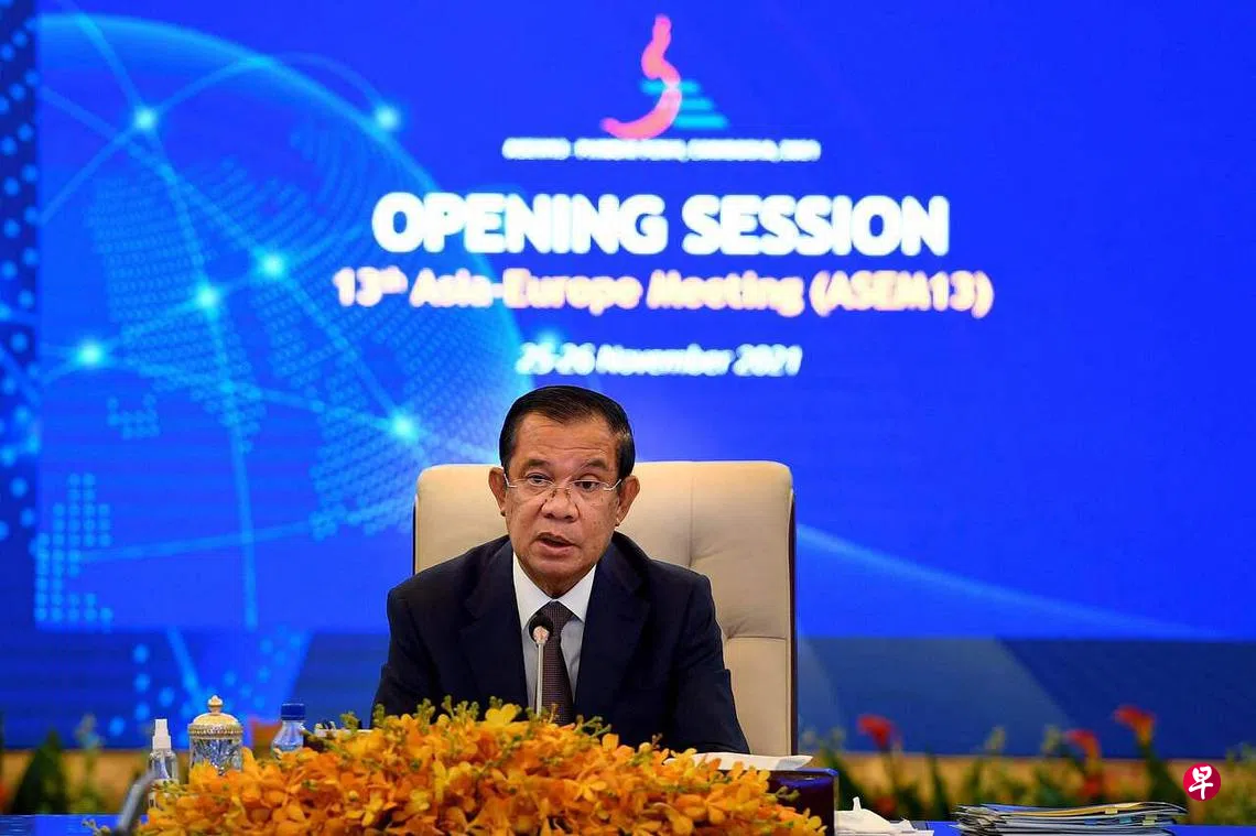 (早报讯)柬埔寨首相洪森在亚欧首脑会议上指出,在后疫情世界中,需要进一步加强亚欧伙伴关系,以强化多边主义,促进可持续且可以共享的全球增长。
