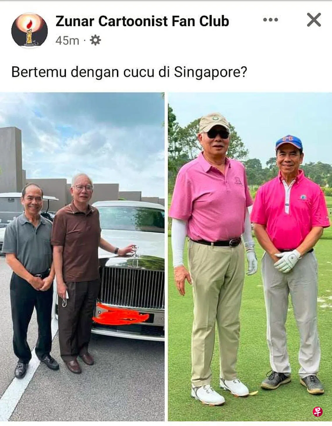纳吉12月初获得马国法庭批准取回国际护照到新加坡探望女儿和新生外孙。马国漫画家祖纳今天下午在面簿张贴两张纳吉与魏成辉的合照,其中一张是两人在一辆劳斯莱斯豪华车子前面,另一张则是在高尔夫球场。祖纳也贴文说:“在新加坡见外孙?”