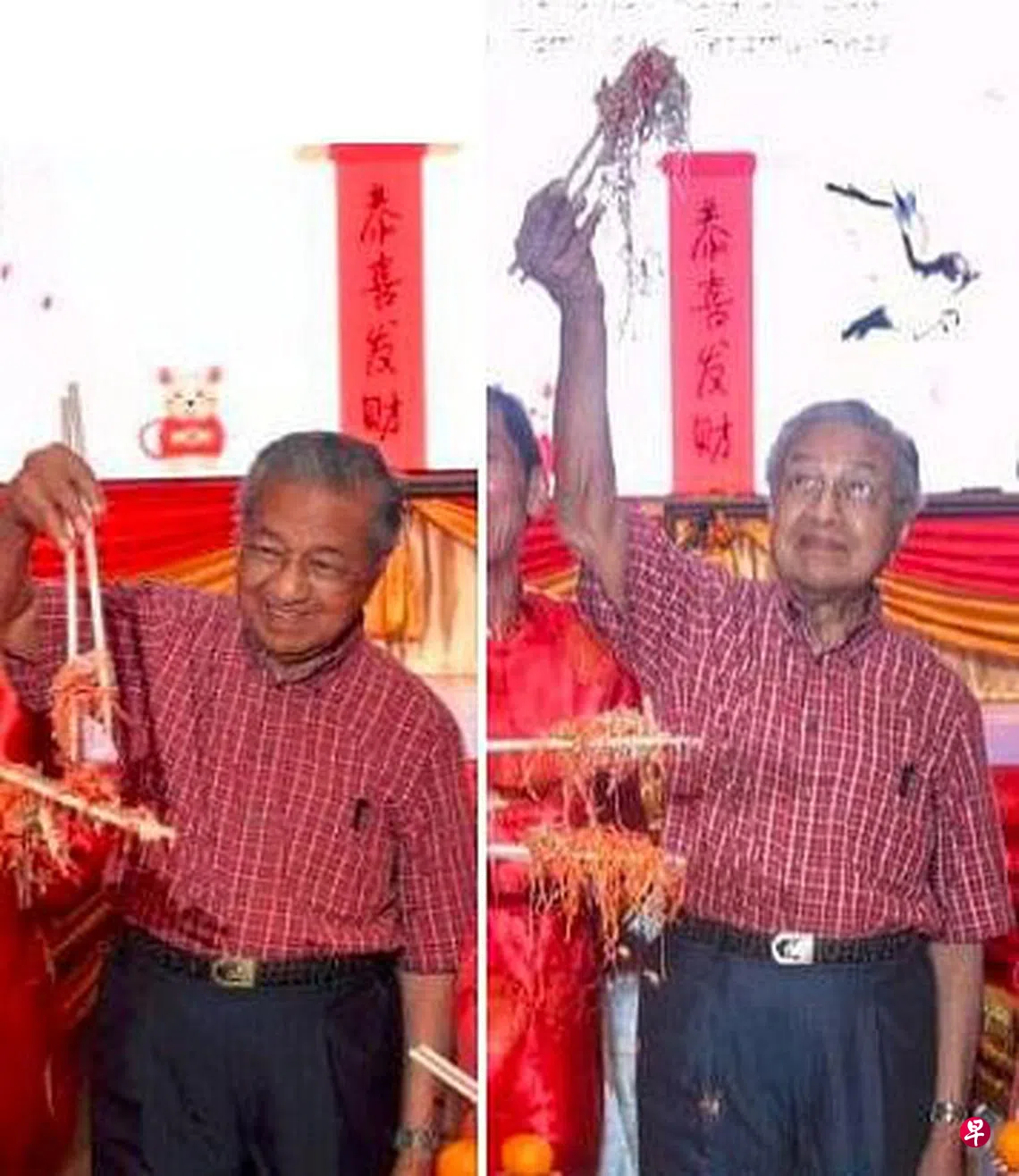 (早报讯)马来西亚前首相马哈迪昨天指马国华族坚持以筷子用餐而难以融入马国社会,另一名前首相纳吉今天就在面簿上传两张马哈迪过去农历新年期间用筷子捞鱼生的照片,讽刺意味十分明显。