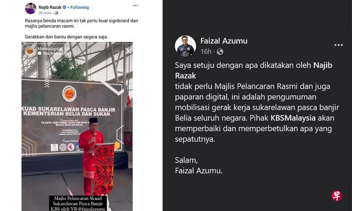 (早报讯)洪水淹没马来西亚多地,救援工作分秒必争。但马国青年及体育部长阿末费沙却办推介救援义工团活动,前首相纳吉抨击多此一举。
