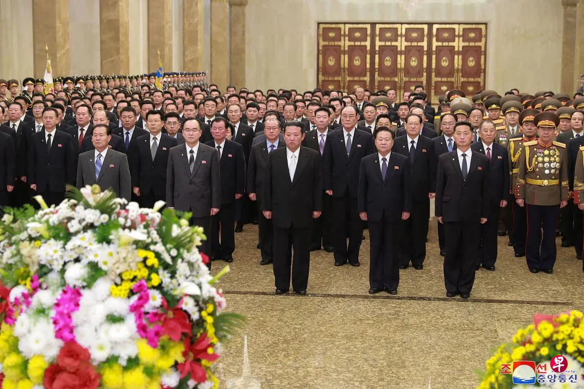 (早报讯)据韩联社报道,朝鲜领袖金正恩周六(1月1日)参谒平壤锦绣山太阳宫。他向金日成和金正日的立像敬献花篮,随后走入朝鲜已故最高领导人金日成和金正日安息的永生厅,瞻仰遗容并鞠躬致敬。