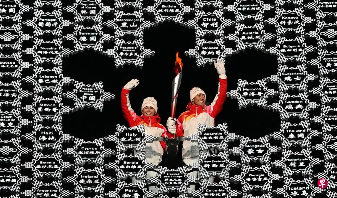 北京冬奥会2月4日晚举行开幕式,最后一棒火炬是由两名中国“00后”冬奥选手——越野滑雪运动员迪妮格尔·衣拉木江和北欧两项运动员赵嘉文,一起将火炬嵌入大雪花形状的主火炬台中。