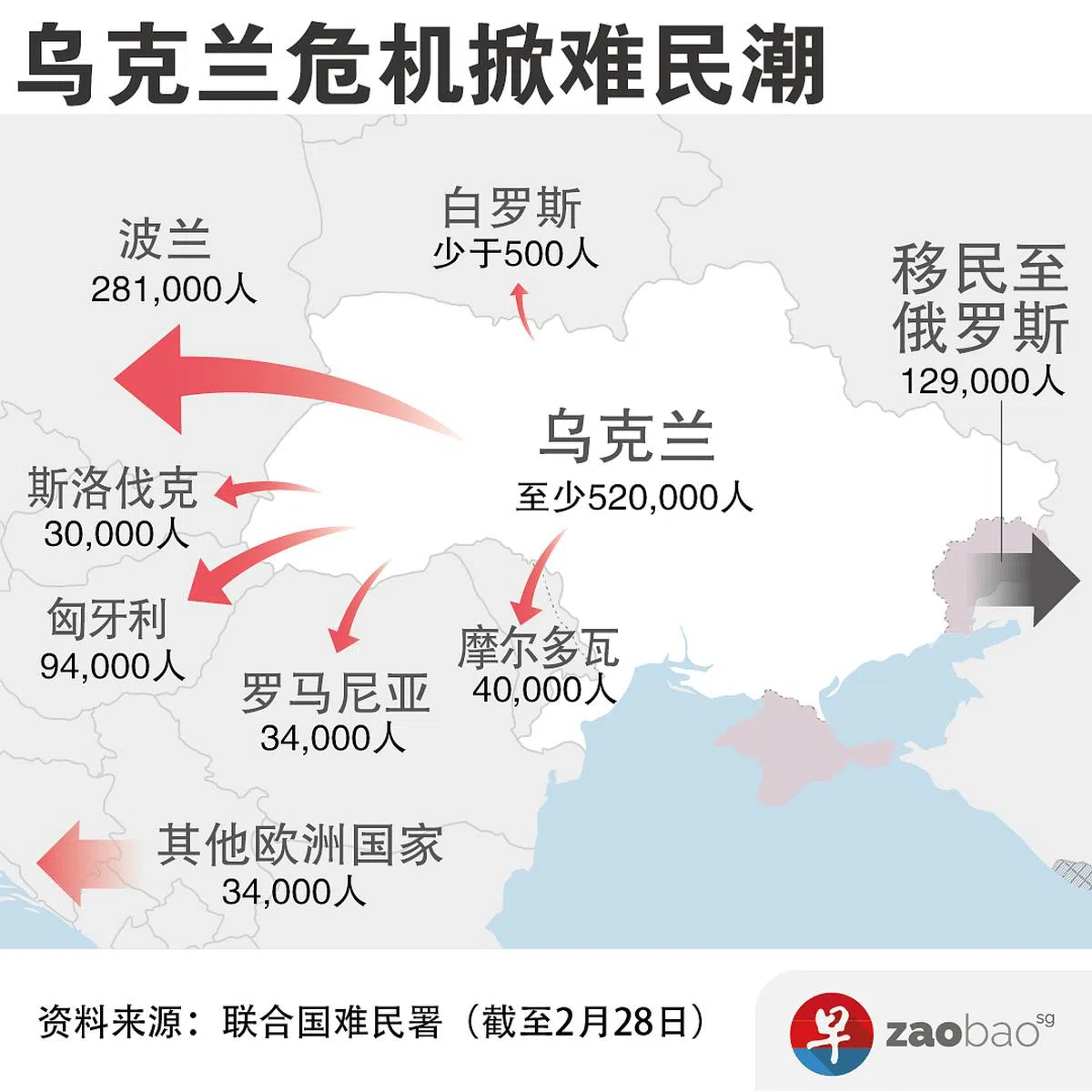 (早报讯)根据联合国难民署最新统计,逾50万名难民已从乌克兰逃至邻国,其中超过半数在波兰。