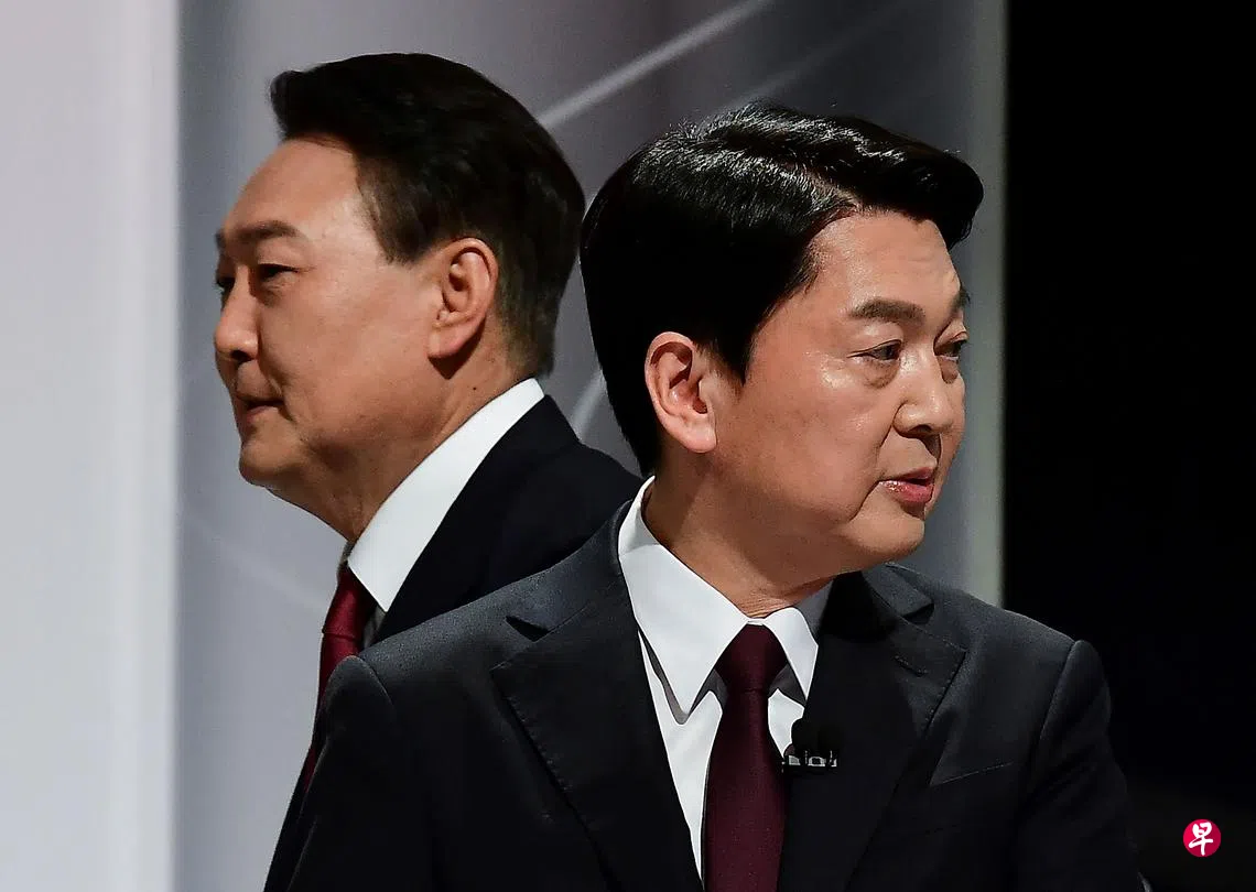 韩国最大在野党国民力量总统候选人尹锡悦和国民之党总统候选人安哲秀周四(3月3日)在国会召开记者会,宣布合推单一候选人,并将在大选后立即推进两党合并。