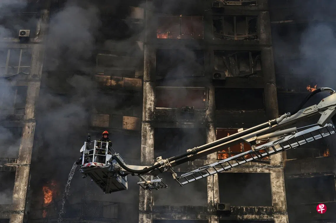 紧急服务中心发布的图像显示,一座高层公寓楼在被击中后起火,救援人员使用移动梯帮助疏散困在建筑物内的居民。