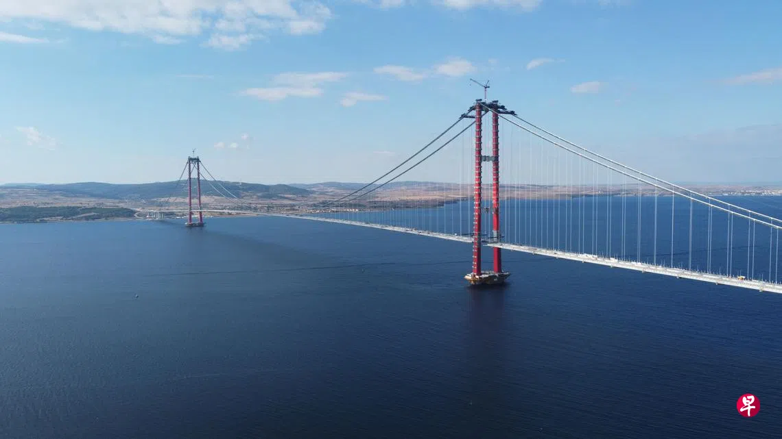 (早报讯)跨越土耳其西北部达达尼尔海峡的世界主跨最大桥梁18日通车,这道世界上最长的悬索桥,把亚洲和欧洲之间的通行时间从约一个小时的渡轮航程减少至6分钟车程。