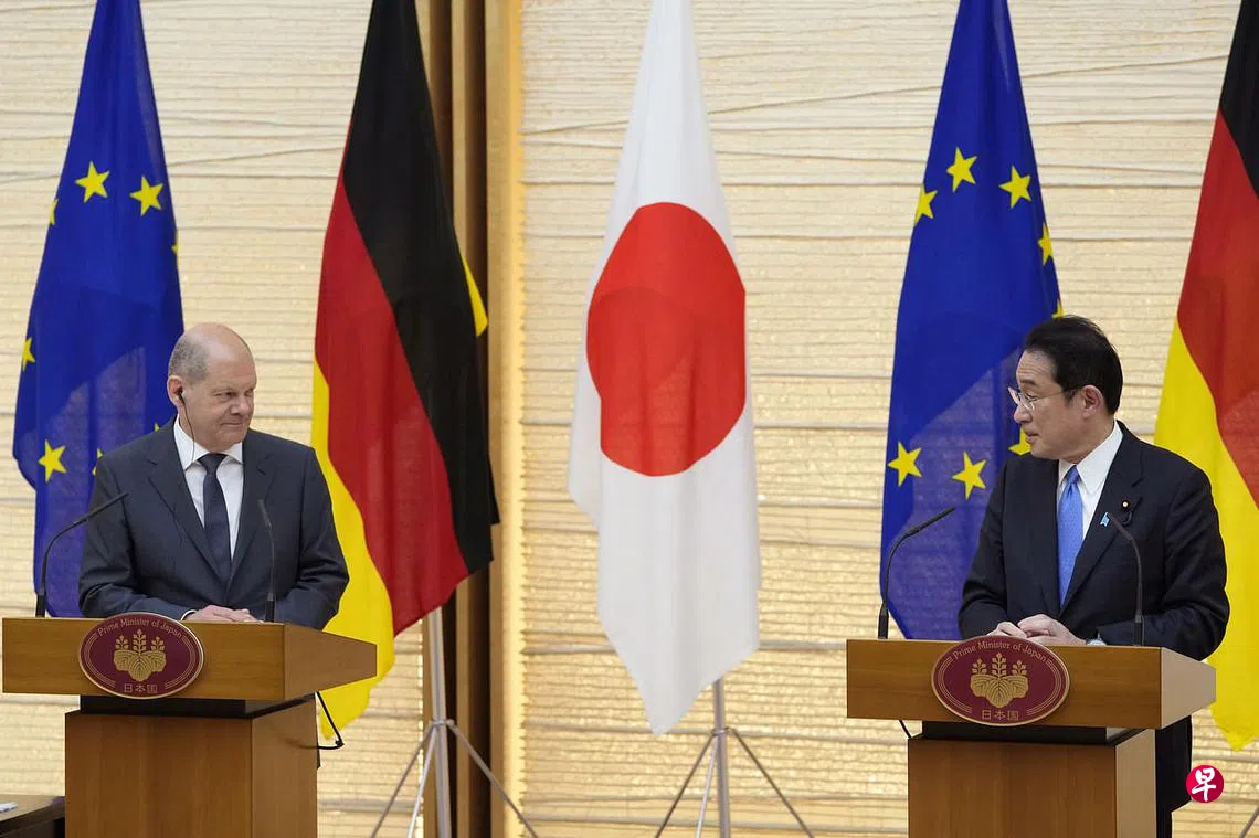 岸田文雄在联合记者会上强调,日本和德国反对俄罗斯入侵乌克兰,他还警告,试图以武力改变领土边界的行为也可能在亚洲出现。