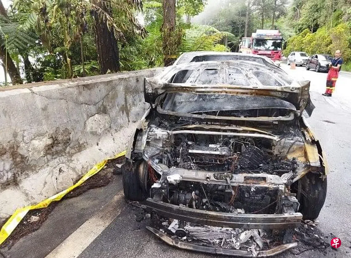 (早报讯)马来西亚著名旅游胜地云顶半山道路昨天(5月9日)下午发生一辆车子失火后,失去动力并顺着道路滑下山事故,后方车子纷纷倒车让路。彭亨州消防局表示,事件并未造成伤亡。