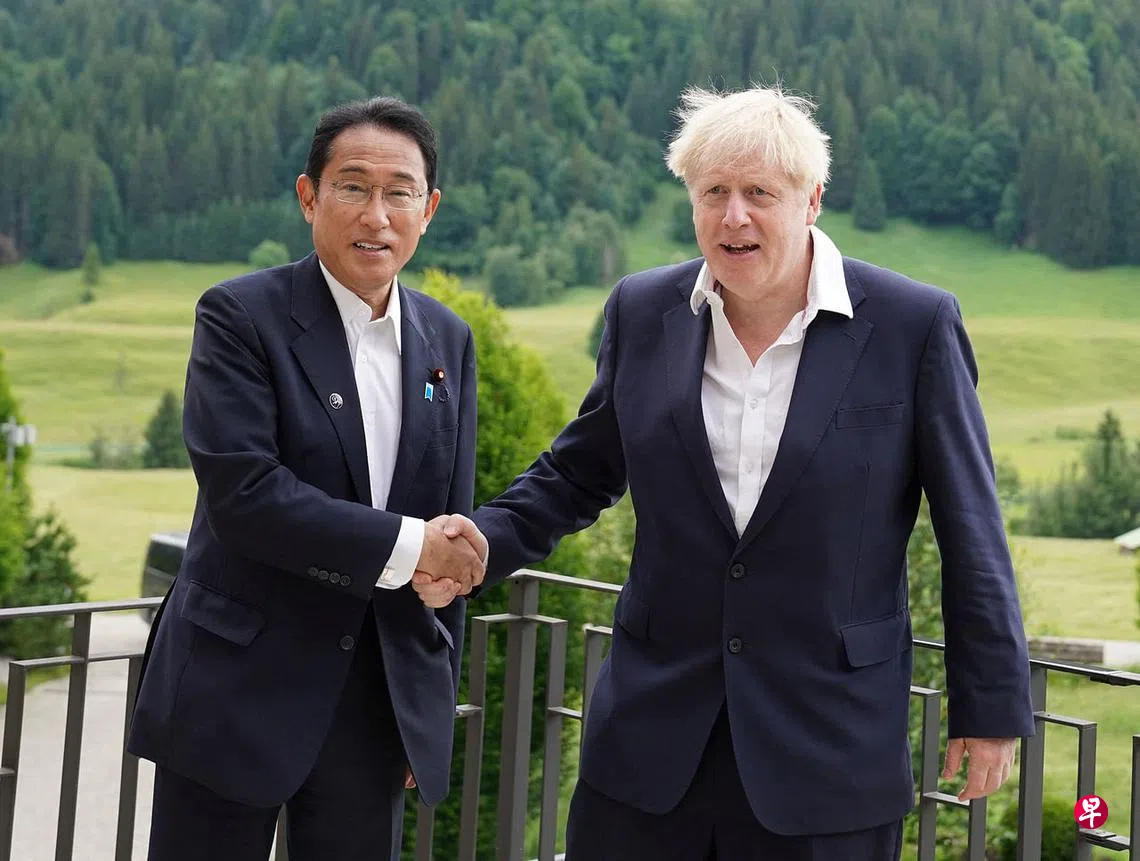 (早报讯)据共同社报道,英国首相约翰逊周二(6月28日)与日本首相岸田文雄在德国巴伐利亚州埃尔毛宫酒店举行会谈。