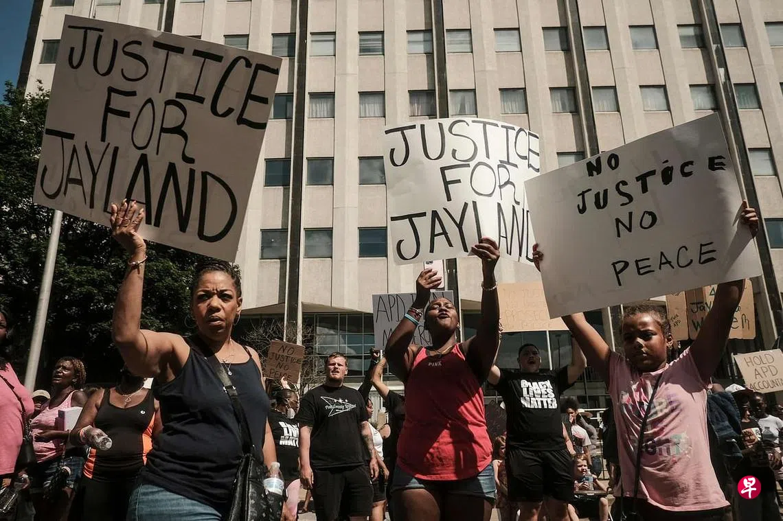 (早报讯)美国俄亥俄州阿克伦市中心星期天(7月3日)聚集了大量抗议者,对6月27日警察枪杀非裔青年杰兰德·沃克案件持续举行抗议游行。