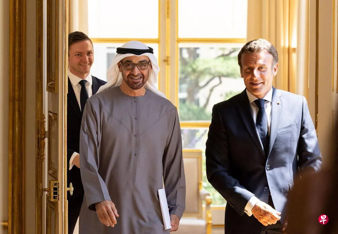 (早报讯)法国总统马克龙星期一(7月18日)在首都巴黎会见到访的阿拉伯联合酋长国总统穆罕默德,双方着重讨论了能源领域合作。