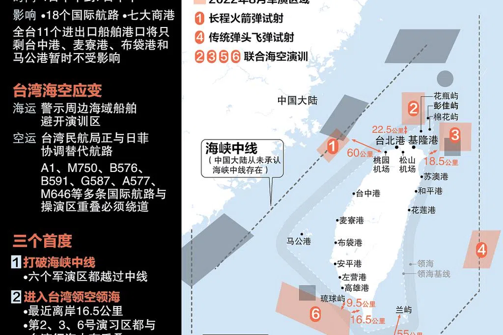 美国众议院议长佩洛西访台后,台海安全局势高度紧张。中国解放军已表明,将从星期四起连续三天在围绕台湾的六个海域和空域展开大规模军演。