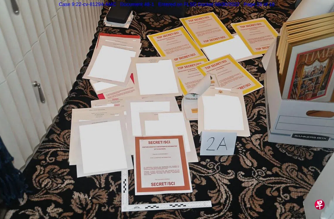 8月8日,美国联邦调查局人员在位于佛罗里达州棕榈滩的海湖庄园执行搜查令。据近期被授权解封的信息,查获物件中有超过1万1000份政府文件和照片,其中100余份标有密级,54份为“秘密”、31份为“机密”、18份为最高级别的“绝密”。