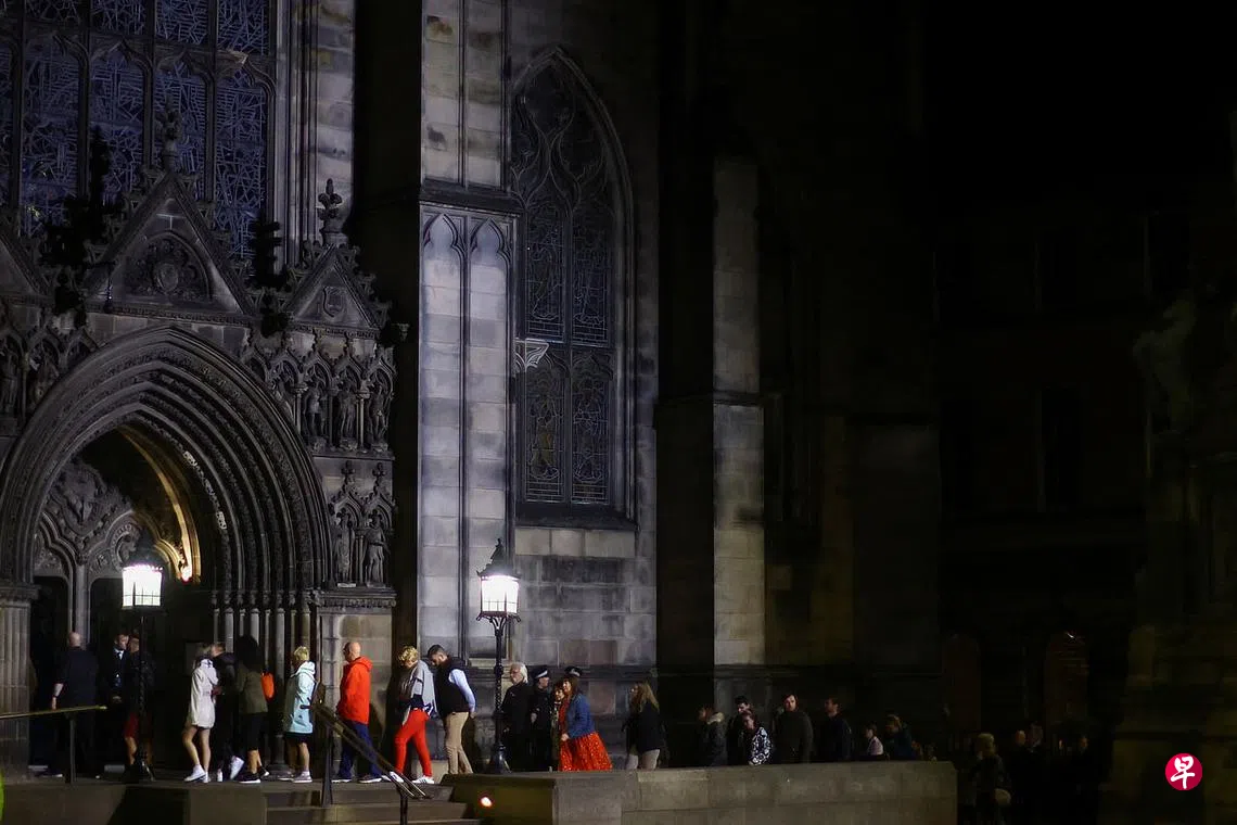 (早报讯)成千上万人在英国爱丁堡圣吉尔斯大教堂外排队等候向英国女王伊丽莎白二世灵柩致哀。