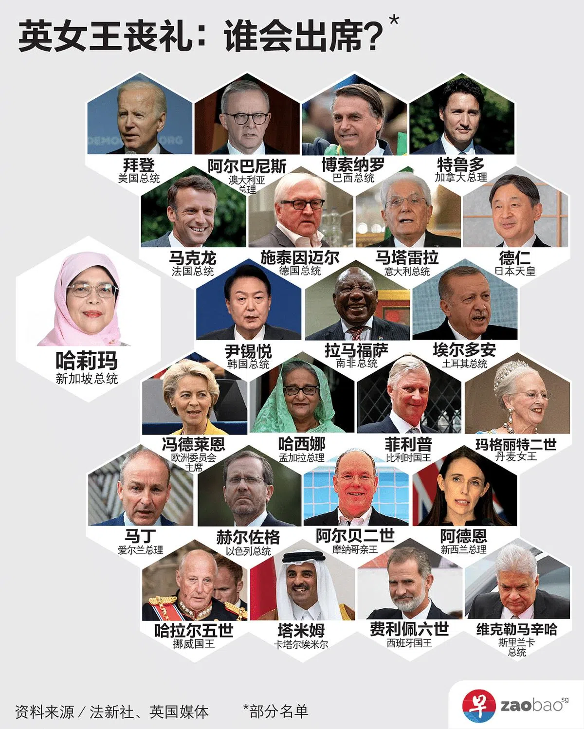(早报讯)根据英国外交部消息,约500名代表近200个国家与地区的宾客将参加英女王伊丽莎白二世的国葬。