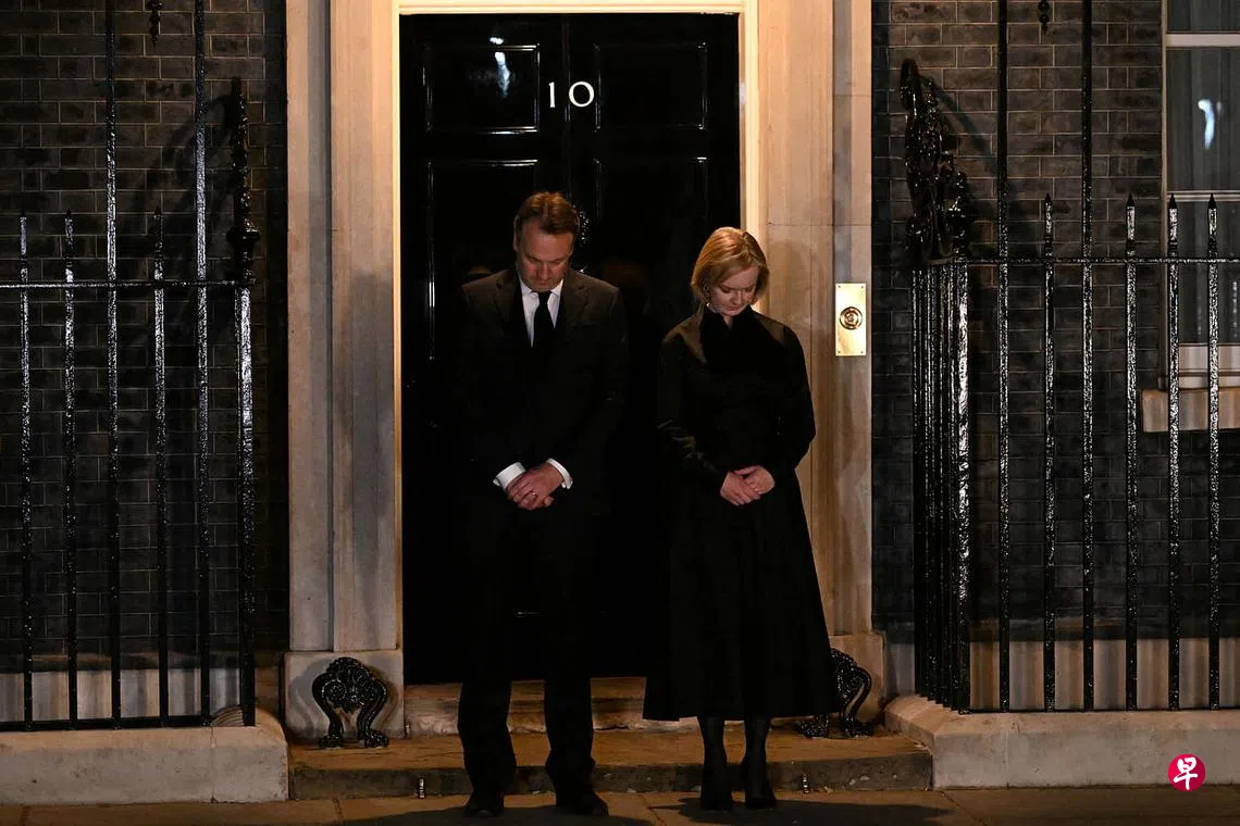 身穿黑色连身裙的英国首相特拉斯站在唐宁街10号官邸外,与全国人民一起低头默哀一分钟。