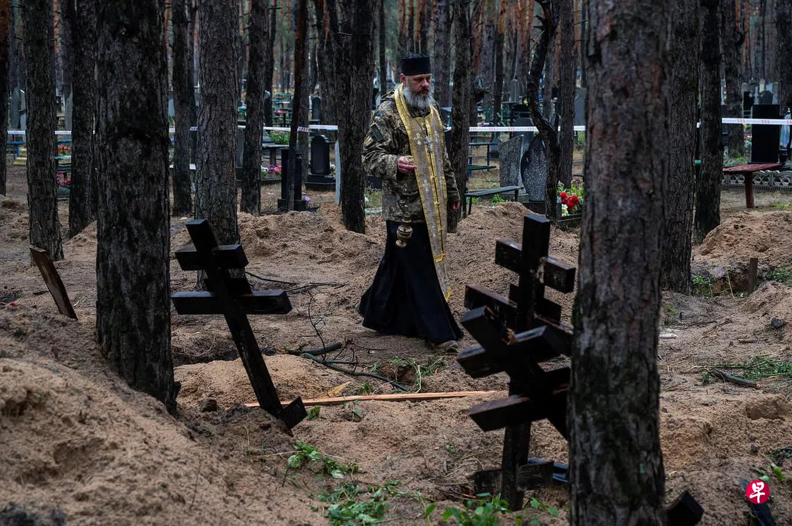 在俄罗斯占领当地数月之后,乌克兰当局本月早些时候在收复的伊久姆一片林地的一个墓地旁发现了一个乱葬岗,并对死亡情况展开了调查。