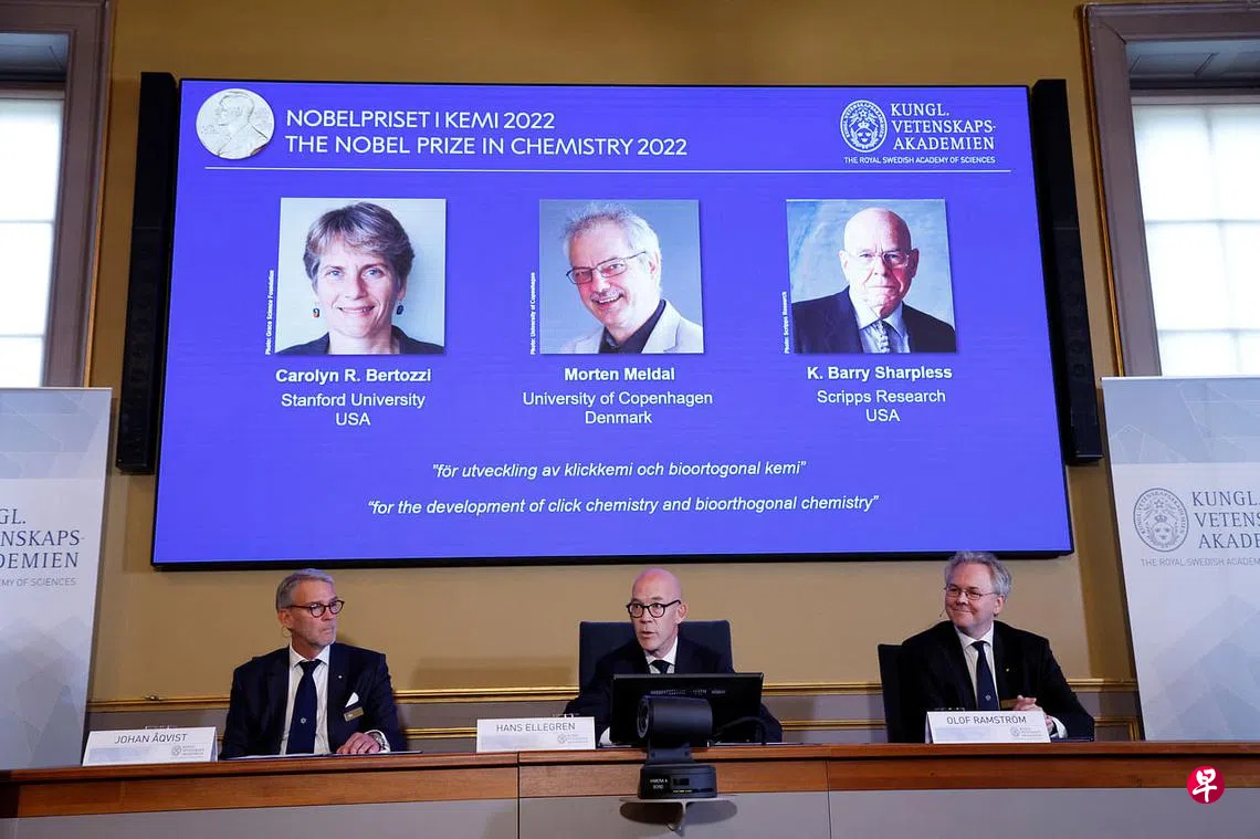 (早报讯)三名分别来自美国和丹麦的科学家卡罗琳·贝尔托西(Carolyn Bertozzi,56岁)、卡尔·巴里·夏普莱斯(K. Barry Sharpless,81岁)和摩顿·梅尔达尔(Morten Meldal,68岁)新加坡时间星期三(10月5日)傍晚5时45分,因“点击化学和生物正交化学的发展”荣获诺贝尔化学奖。