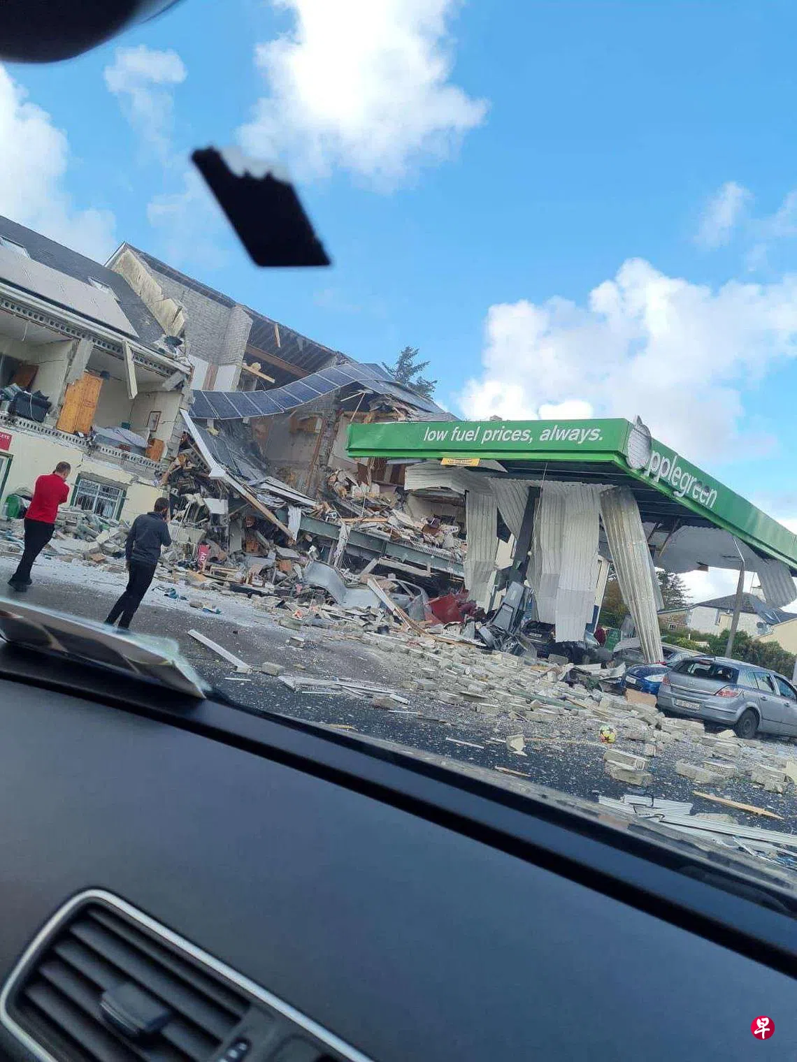 案发现场的照片显示,加油站范围内的一栋建筑物墙壁被炸毁,屋顶部分倒塌,碎片散落在附近的停车场。