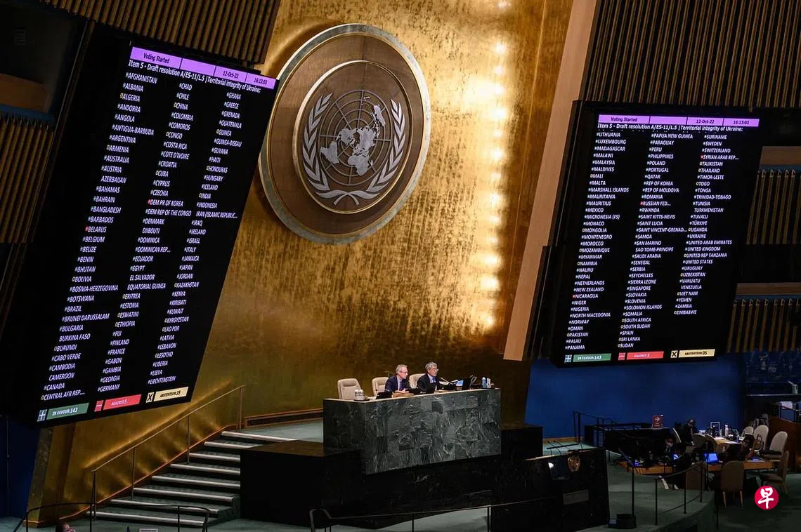 (早报讯)联合国大会星期三(10月12日)以压倒性的票数谴责俄罗斯吞并乌克兰部分地区,美国总统拜登说,这向俄罗斯发出了一个“明确的信息”。