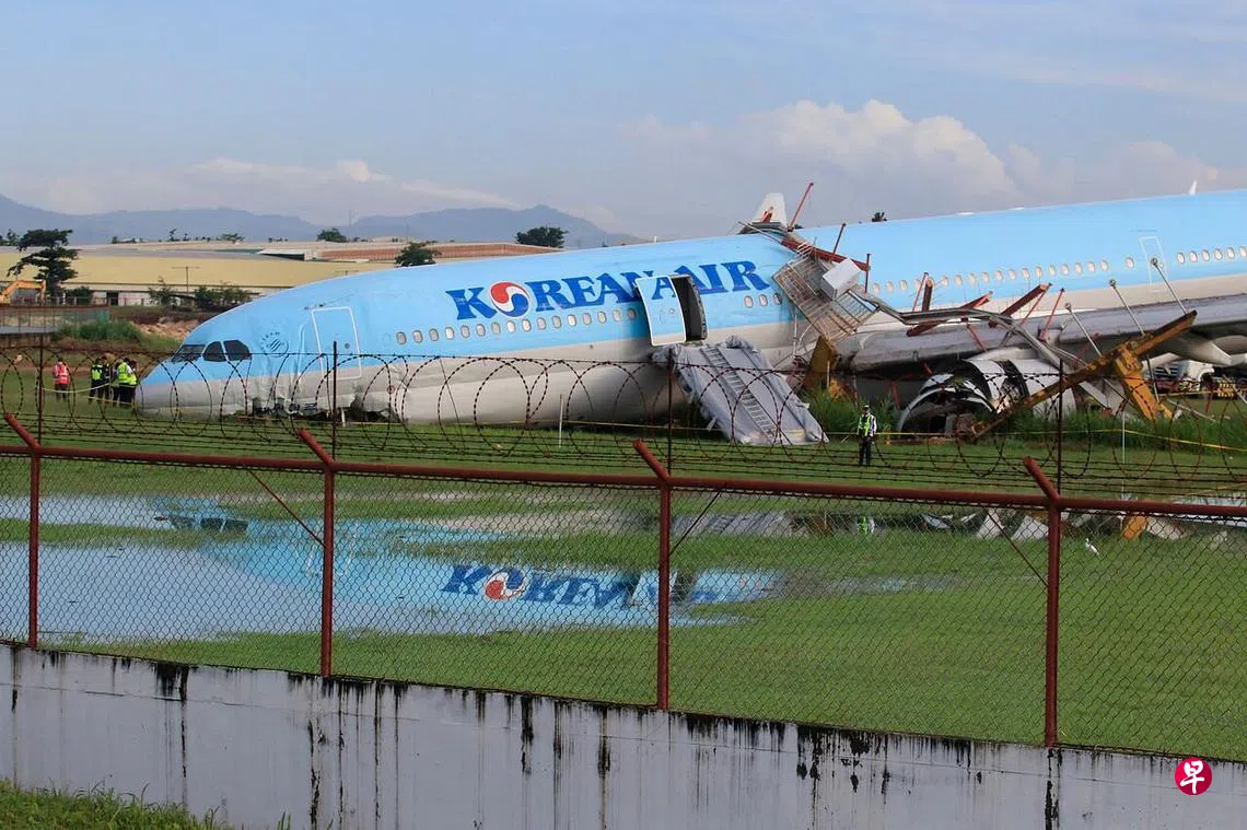 (早报讯)大韩航空一架载有173人的飞机星期天(10月23日)晚上在菲律宾宿务(Cebu City)国际机场降落时冲出跑道,所幸没有人员受伤。