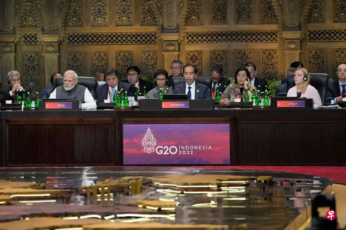 印尼总统佐科(中)星期二(11月15日)在二十国(G20)峰会上说,G20成员国必须结束战争。坐在他的左右边分别为意大利总理梅洛尼和印度总理莫迪。(法新社)