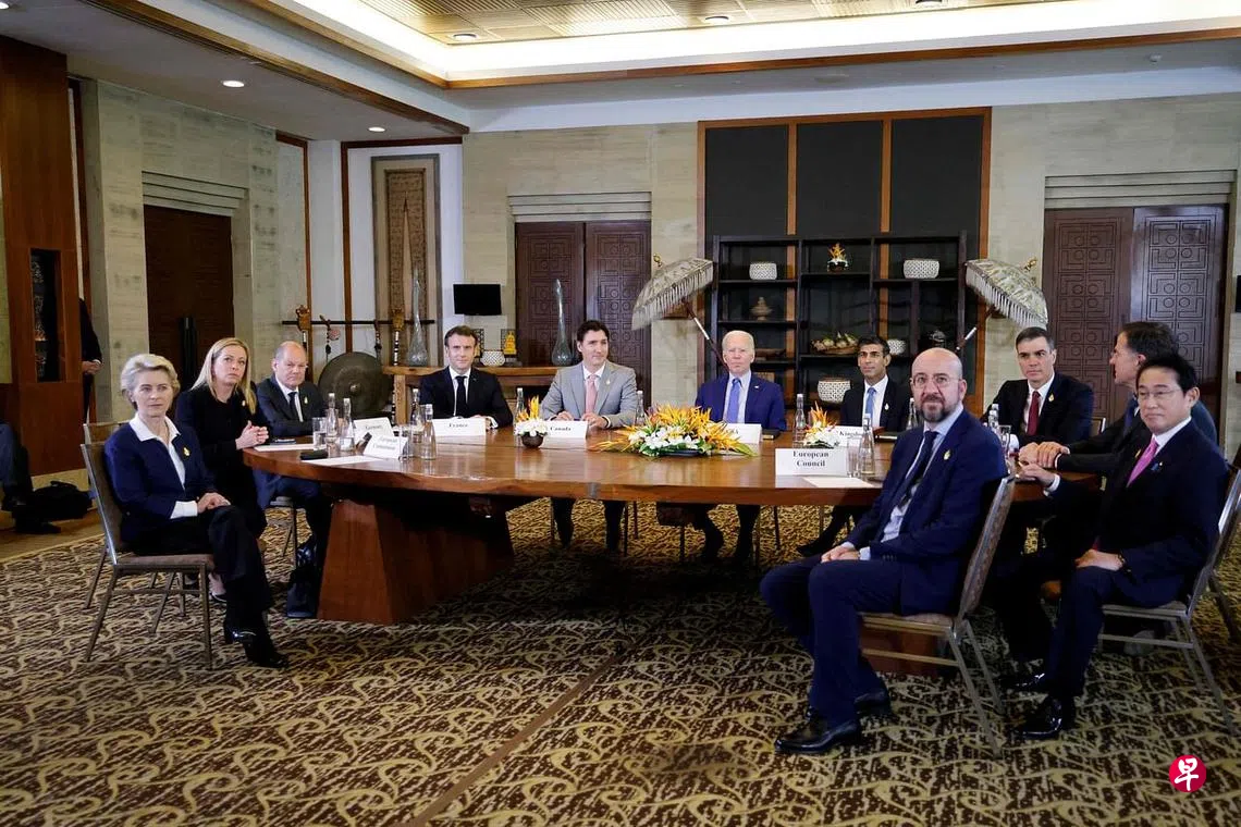 根据白宫和欧盟官网发布的联合声明,加拿大、法国、德国、意大利、日本、荷兰、西班牙、英国、美国、欧盟委员会,以及欧洲理事会领导人,在印度尼西亚峇厘岛二十国集团(G20)峰会期间会面。