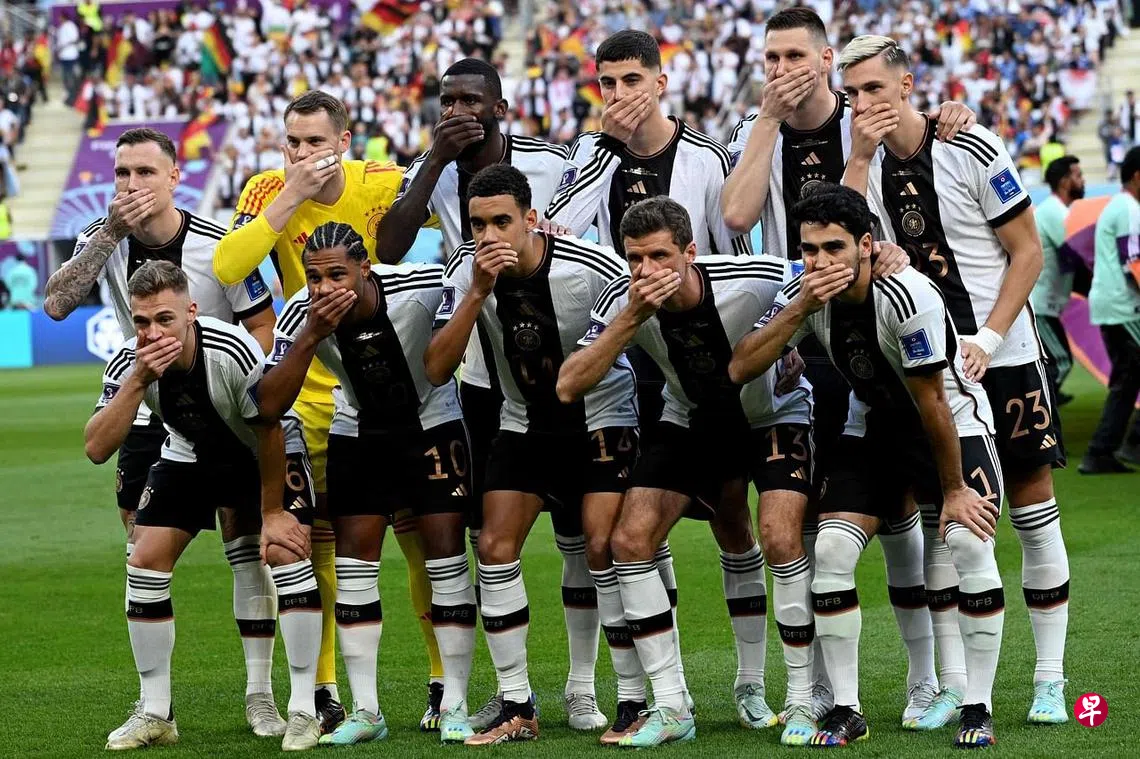 (早报讯)德国国家队在星期三(11月23日)对垒日本的世界杯E组小组赛中,全体首发队员在拍摄赛前团体照时用手捂住嘴巴,以抗议国际足总禁止球队穿戴支持LGBTQ群体的“OneLove”彩色臂章参赛的决定。
