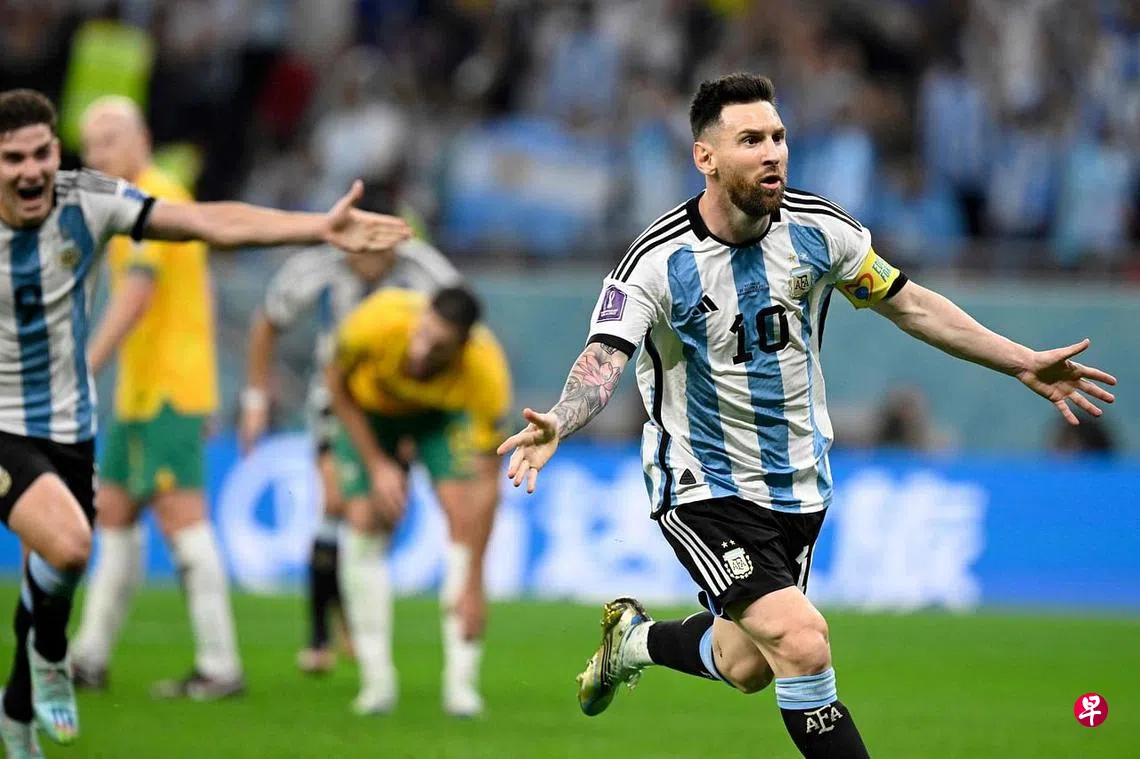 (早报讯)卡塔尔世界杯16强星期日(12月4日)凌晨结束第二场赛事,球王梅西(Messi)完成破门,前锋阿尔瓦雷斯(Alvarez)扩大比分,澳洲前锋古德温(Goodwin)远射变向扳回一城,阿根廷2比1击败澳大利亚,顺利挺进八强。