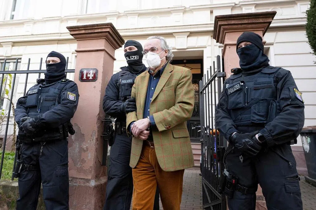 德国检察署星期三(7日)宣布,当局出动3000名军警在德国11个区域展开大搜捕,在柏林、巴登—符腾堡州、巴伐利亚州、黑森州、下萨克森州、萨克森州、图林根州抓获23个属于“第三帝国公民”(Citizens of the Reich)的极端分子,另外两人在奥地利与意大利落网。被捕者包括一名现役德军与几名后备军人,这名现役德军是德国特种部队成员。他们密谋推翻政府和攻击国会。