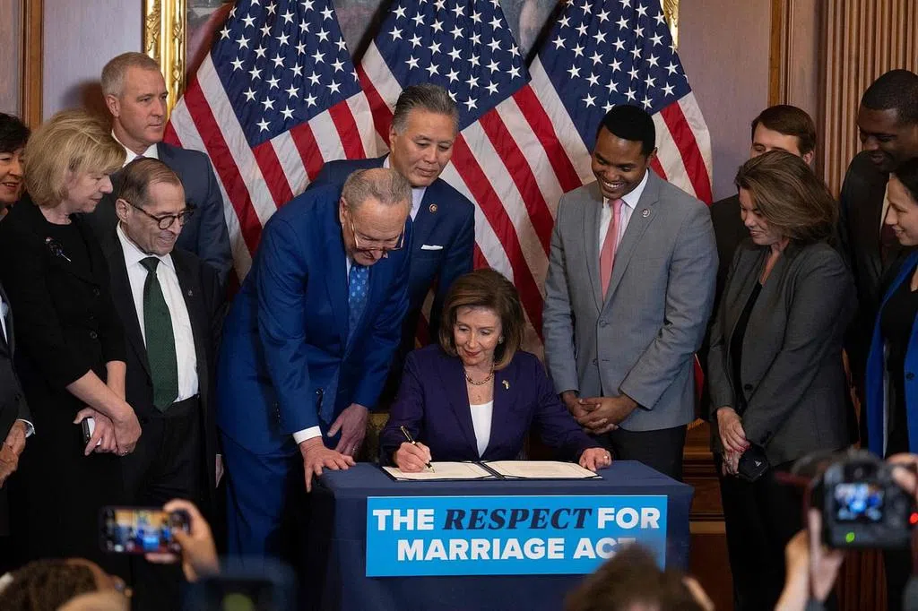 众议院议长佩洛西在白宫的签字仪式上说:“对数百万美国人来说,这项法律是必要的,而且绝对是根本性的。”她说,新法体现了平等,确保同性和跨种族伴侣能够获得婚姻提供的所有法律保护和经济利益。