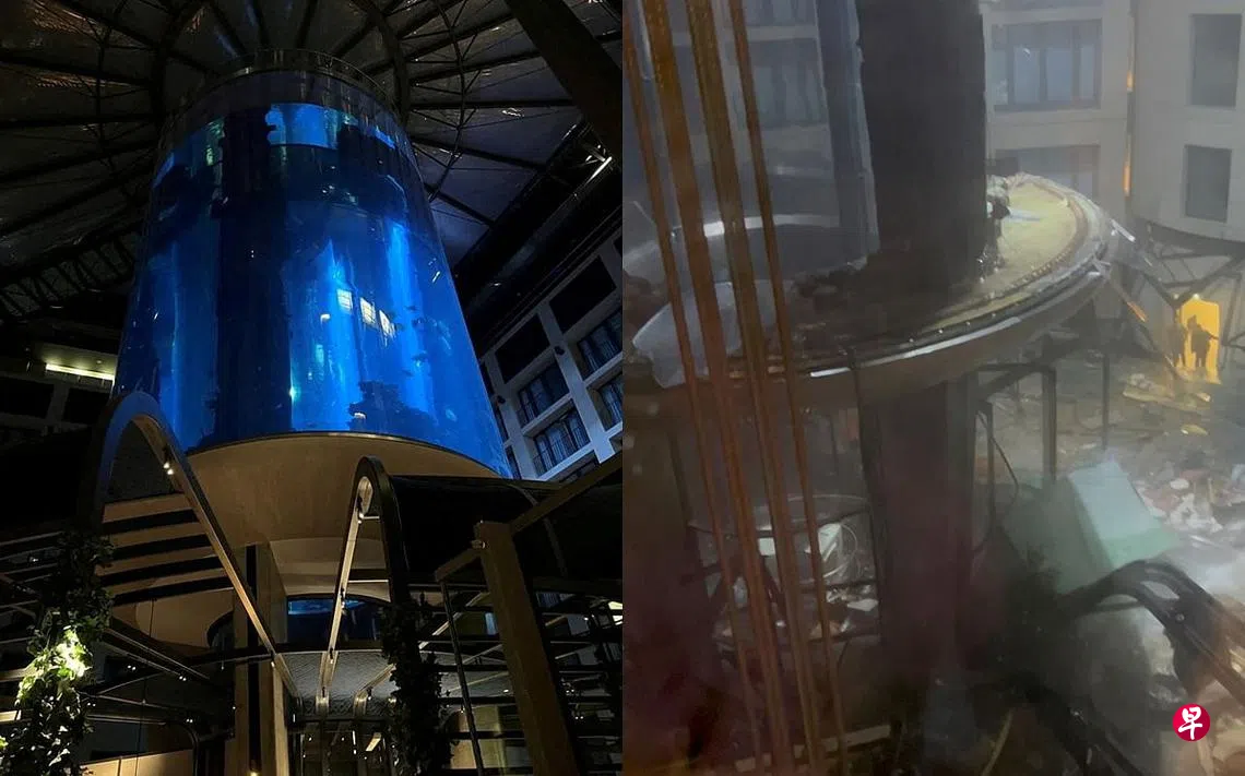 综合路透社和法新社报道,警方发言人说,事故发生在当地时间凌晨5时50分(新加坡时间中午12时50分)。紧急服务部门出动100名消防员到现场援助。柏林消防队发推文说:“水族箱破损,有水渗出。目前情况不明。”