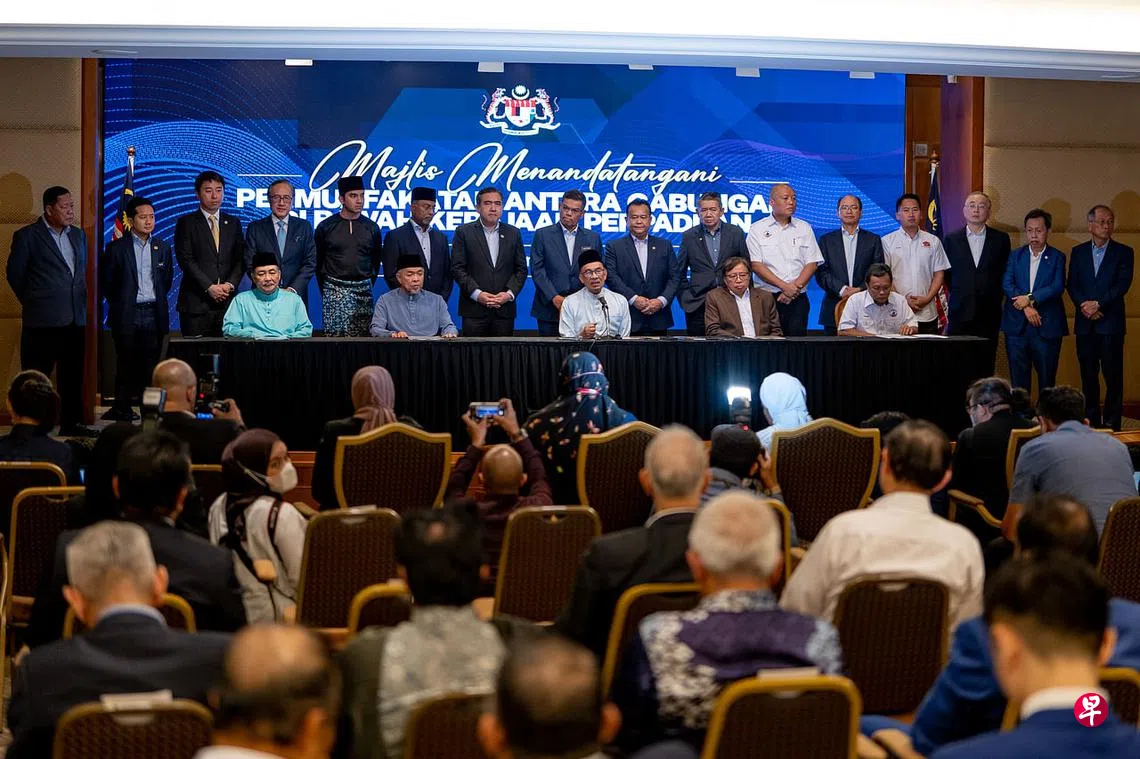 (早报讯)马来西亚团结政府的所有政党及政治联盟领袖星期五(12月16日)签署“共组团结政府合作协议”,承诺他们的国会议员会在所有与信任动议相关的动议及供应法案,或任何能影响政府合法性的动议中支持首相安华,以确保安华领导的团结政府稳定,完成五年任期。