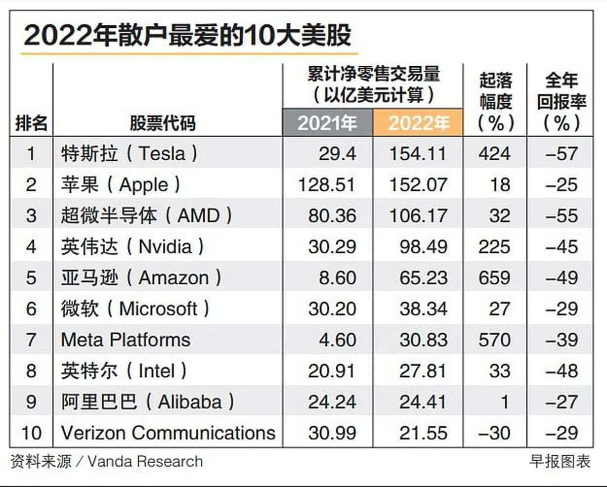 美国数据公司VandaTrack答复《联合早报》询问时提供上述资料,以及美国股市在2022年最受散户欢迎的10大美国股票名单。