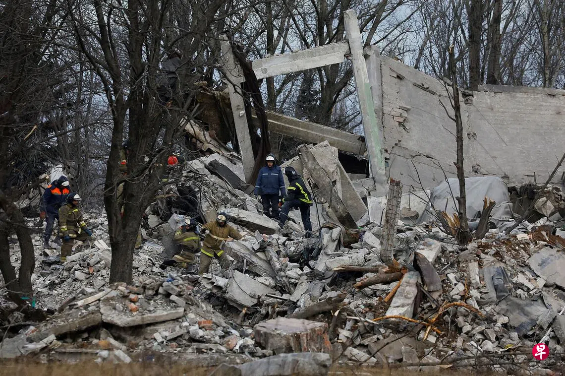 俄罗斯国防部星期天(8日)称,俄军对乌克兰东部一个临时安置乌军的建筑物进行大规模火箭弹袭击,造成超过600名乌军丧命。图为2023年1月4日,乌军对俄控乌东城镇马克耶夫卡展开的导弹袭击后,造成一建筑物倒塌。(路透社)