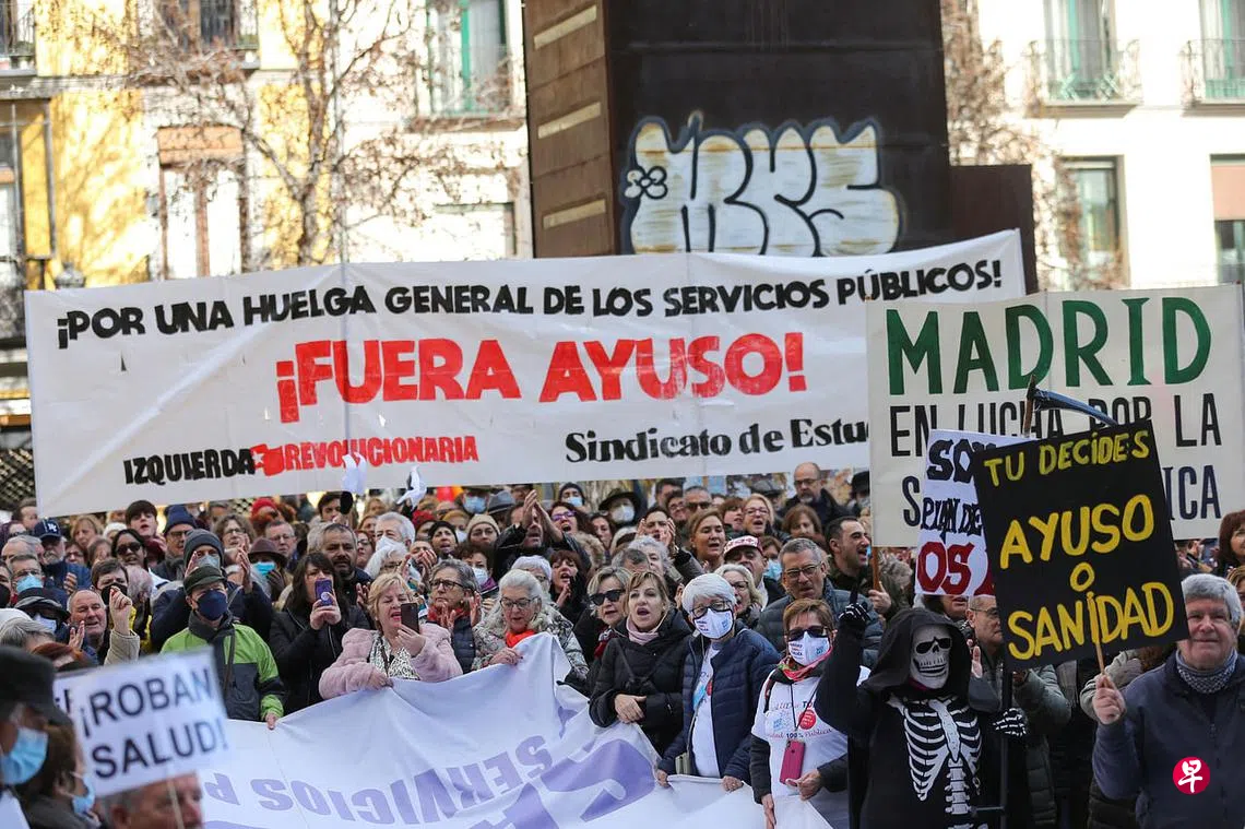 (早报讯)西班牙数以万计的医护人员星期天(1月15日)在首都马德里举行示威,抗议地方政府破坏公共医疗体系。