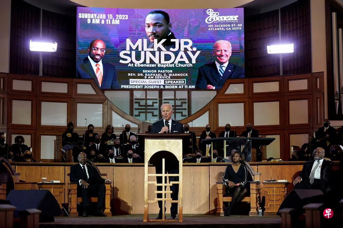 路透社报道,星期一(1月16日)为马丁·路德·金纪念日,拜登应佐治亚州民主党籍参议员沃诺克的邀请,于星期天(15日)到亚特兰大埃比尼泽浸信会教堂的礼拜布道会上致辞。沃诺克为埃比尼泽浸信会教堂的牧师。