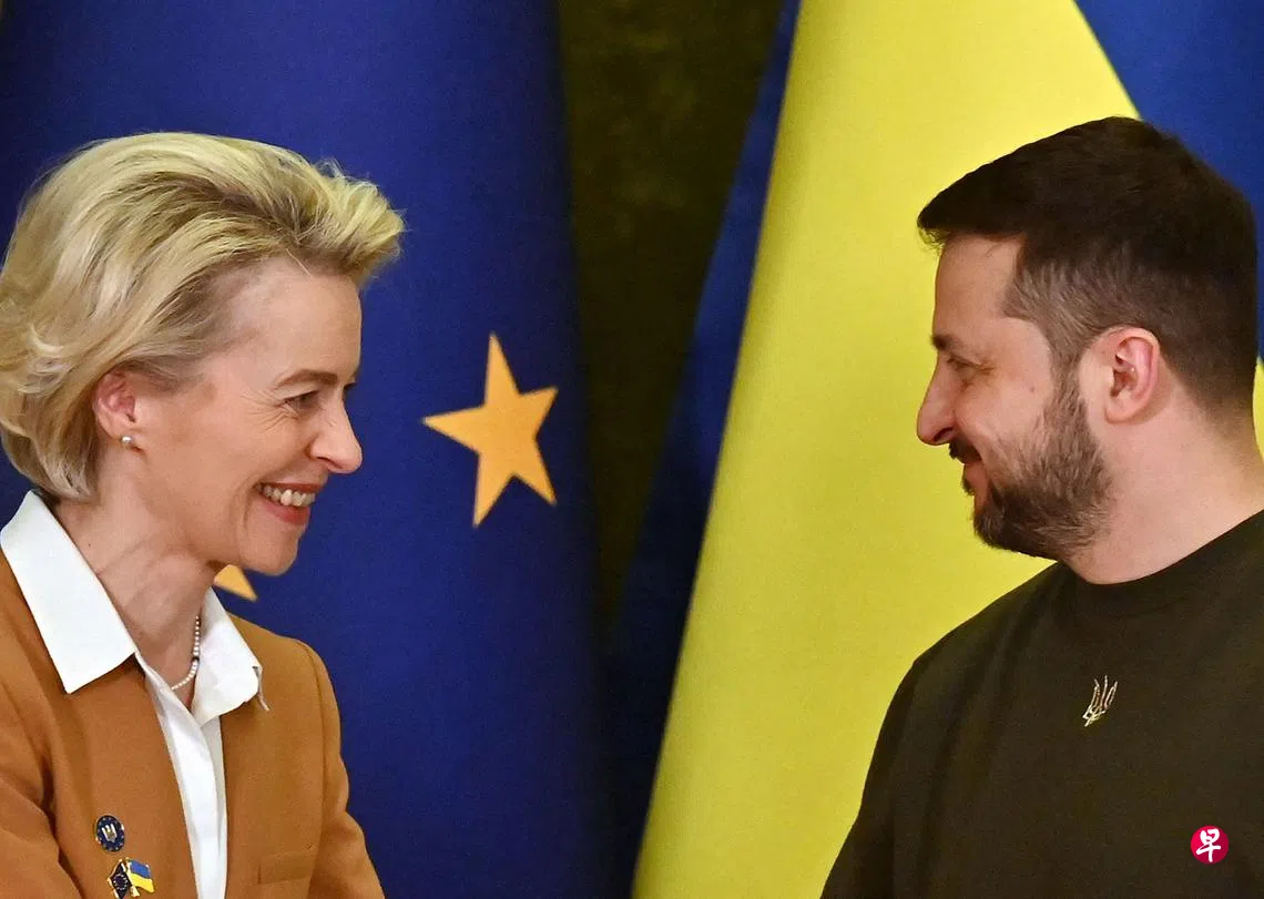 冯德莱恩在与泽伦斯基联合召开的新闻发布会上说:“这是民主国家与独裁政权的斗争。我们将继续加大对莫斯科的施压。”