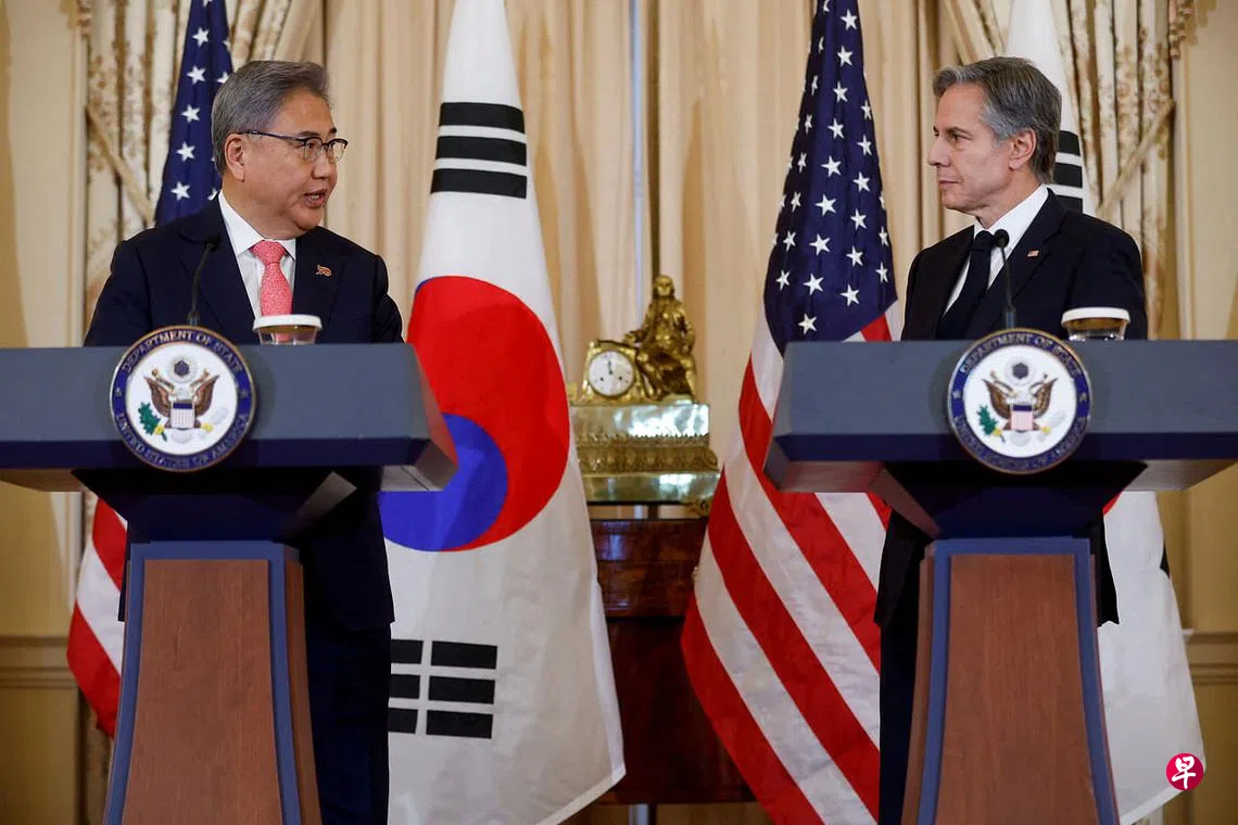 (早报讯)韩国外交部长朴振和美国国务卿布林肯在华盛顿特区举行双边会谈,双方重申朝鲜半岛无核化原则,并商定将加强利用包括核武等所有战略资产的延伸威慑力,以应对朝鲜核威胁。