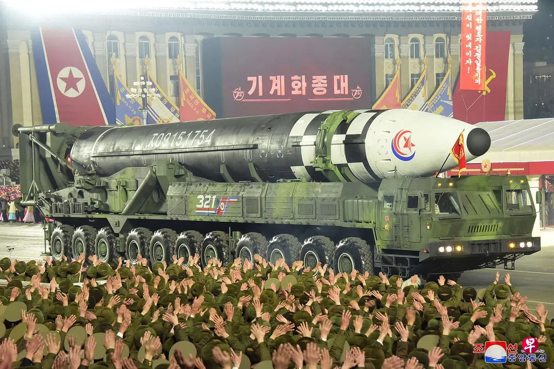 (早报讯)朝鲜星期三(2月8日)举行阅兵仪式纪念朝鲜人民军成立75周年,朝鲜最高领导人、国务委员会委员长金正恩出席活动。多方相关图片显示,洲际弹道导弹(ICBM)、新型导弹等武器在仪式上亮相。