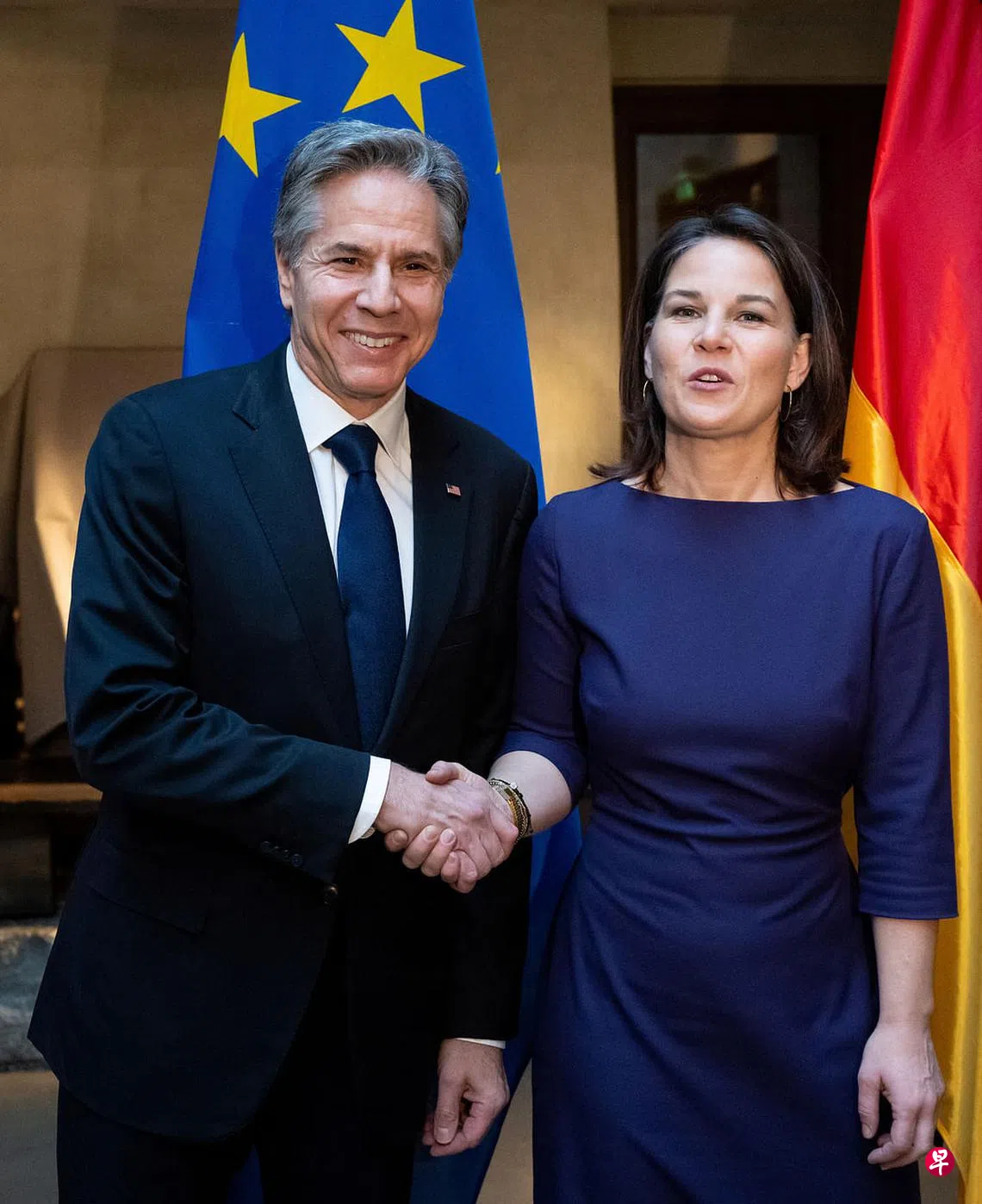 美国国务卿布林肯、法国外长科隆纳、德国外长贝尔伯克和英国外长克莱弗利,在第59届慕尼黑安全会议的会场外举行了会议。