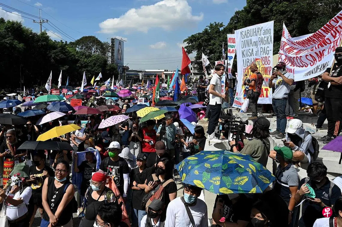 (早报讯)菲律宾抗议者星期六(2月25日)举行一场喧闹的游行集会,庆祝“人民力量革命”37周年。