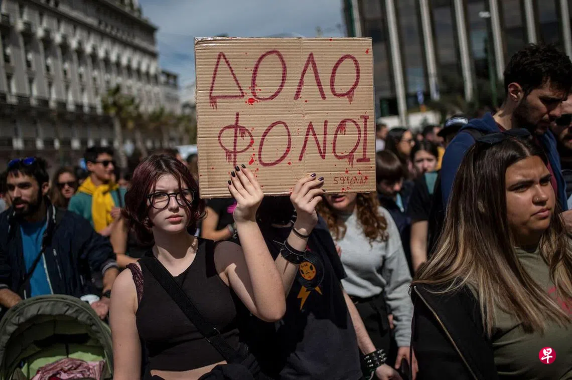 学生们更是高呼“凶手”,还有游行者分发总理米佐塔基斯戴着火车站长帽的传单,上面写着“这是每个人的错,但不是我的错”。
