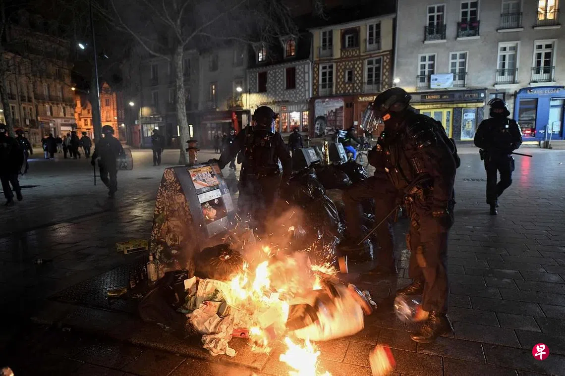 (早报讯)在法国政府动用宪法第49.3条,未经表决通过了养老金改革法案后,抗议呼声此起彼伏。截至星期六(3月18日),巴黎警方已连续第三天与抗议者爆发冲突。
