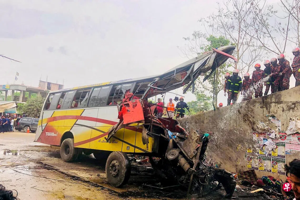 法新社引述警方消息报道,事故发生在孟加拉南部希布查尔区(Shibchar)。警方说,巴士于当地时间上午8时(新加坡时间上午10时)失控撞上高速公路护栏,翻滚了九米,最终坠入沟渠。
