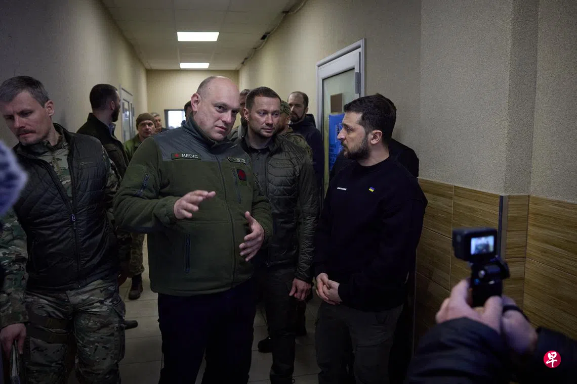(早报讯)乌克兰总统泽连斯基星期三(3月22日)前往乌东重镇巴赫穆特附近军事基地视察,向在地乌军握手颁奖,以示感谢。
