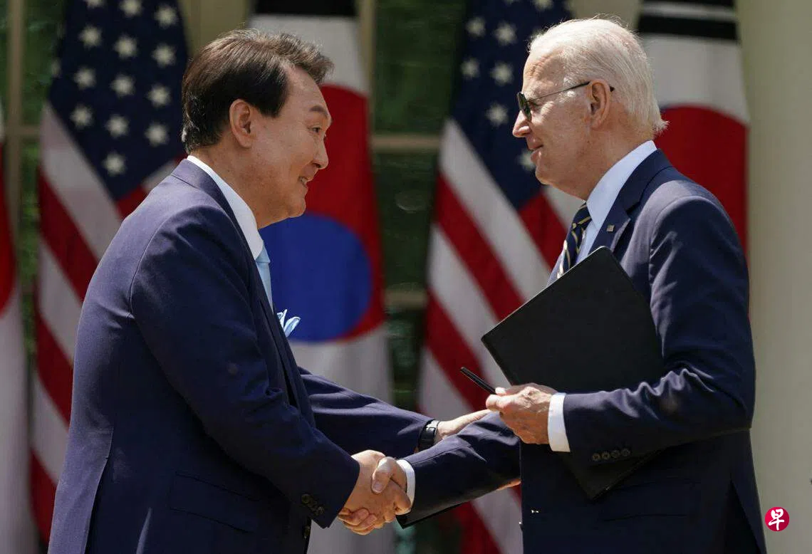 综合路透社和韩联社报道,美国总统拜登与韩国总统尹锡悦星期三(4月26日)在白宫举行首脑会谈,涉及的问题包括朝鲜、半导体晶片和贸易以及俄乌战争,并发表了应对朝鲜的《华盛顿宣言》(Washington Declaration)。